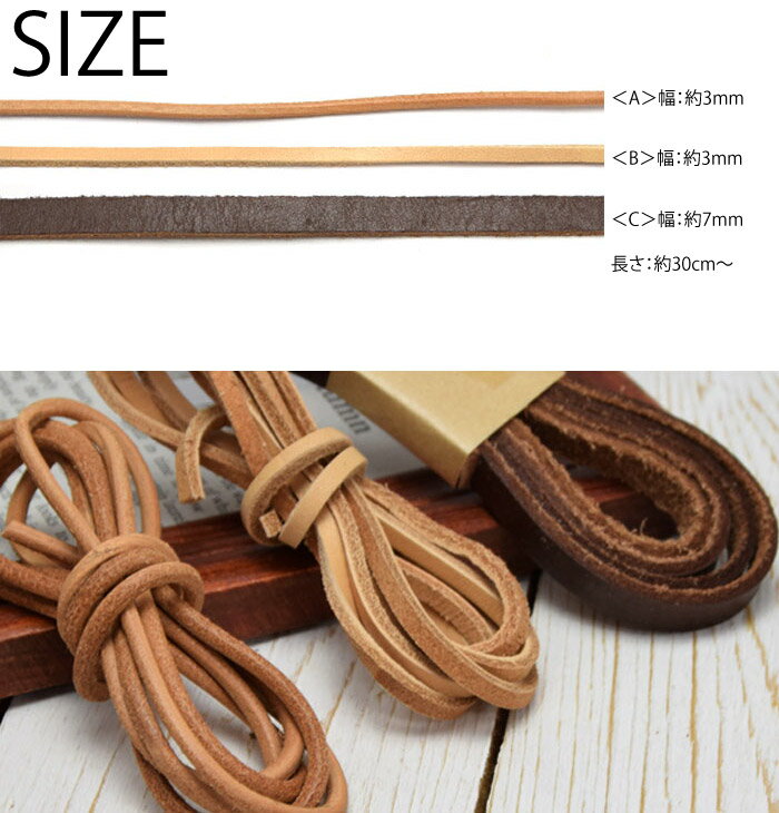 商品名 <計り売り30cm単位> レザー紐本革(ナチュラル) (CORD-100-012) 入数 計り売り:約30cm〜 (30cm単位でご注文いただけます) 個数1=30cmとしてご注文ください デザイン A<丸紐> ・ B<平紐/3mm> ・ C<平紐/7mm> 材質 本革 原産国 中国 知っておいて頂きたいこと ※場所によって質感や柔らかさが多少異なる場合や、等間隔に継ぎ目がある、丸ひもが円形ではない箇所がある場合などがございますが、天然素材のためご了承くださいませ。
