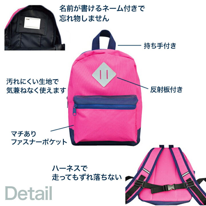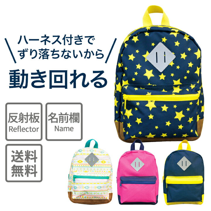 ▶Info: キッズ リュックサック 動き回ってもずり落ちないベルト付 キッズが元気に動き回ってもリュックがずり落ちないハーネスベルト付き!フロントには反射板が付いて通園・通学も安心です。