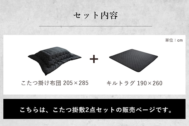 商品詳細 セット内容 厚掛けこたつ掛布団 キルトラグ サイズ 掛布団:約205×285cm / キルトラグ:約190×260cm (キルティング加工許容範囲 +5%−3%) 適応こたつ台サイズ 約80〜90×135〜150cm のこたつ台対応 カラー デニムNV/デニムGY/デニムKH/デニムBK/つむぎBR/つむぎGN/つむぎBE/つむぎBK/刺し子BR/刺し子NV 組成:こたつ掛布団 表地=綿100% 裏地=ポリエステル100%(ピーチスキン) 中材=中空ポリエステル綿100% 3.0kg 組成:キルトラグ 表地=綿100% 裏地=ポリプロピレン不織布100%(ドット滑り止め加工) 中材=(上層)中空ポリエステル綿100% (下層)ウレタンフォーム10mm 原産国 中国製 洗濯表示 液温は40℃を限度とし、手洗いができる。