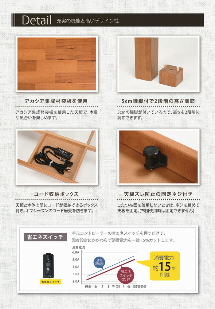 【商品サイズ】(約)幅105×奥行75×高さ37(継脚時42)cm【材質】天板:アカシア集成材突板(UV塗装) 塗装:ウレタン樹脂塗装 ヒーター:LH-G6FC 石英管ヒーター(手元電子コントローラー)【機能】■ 天板固定ネジ付き■ コード収納ボックス付き【代引きについて】こちらの商品は、代引きでの出荷は受け付けておりません。